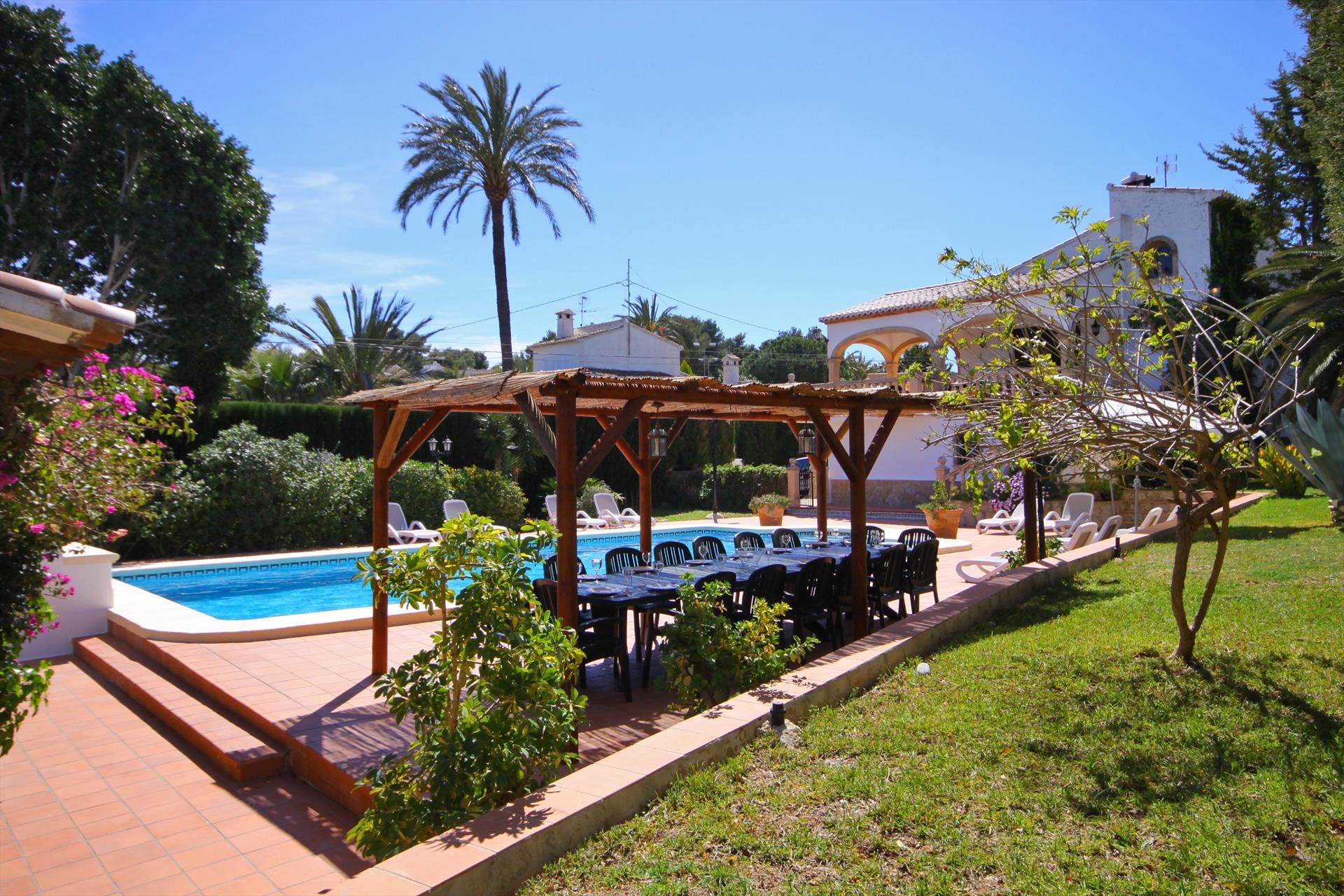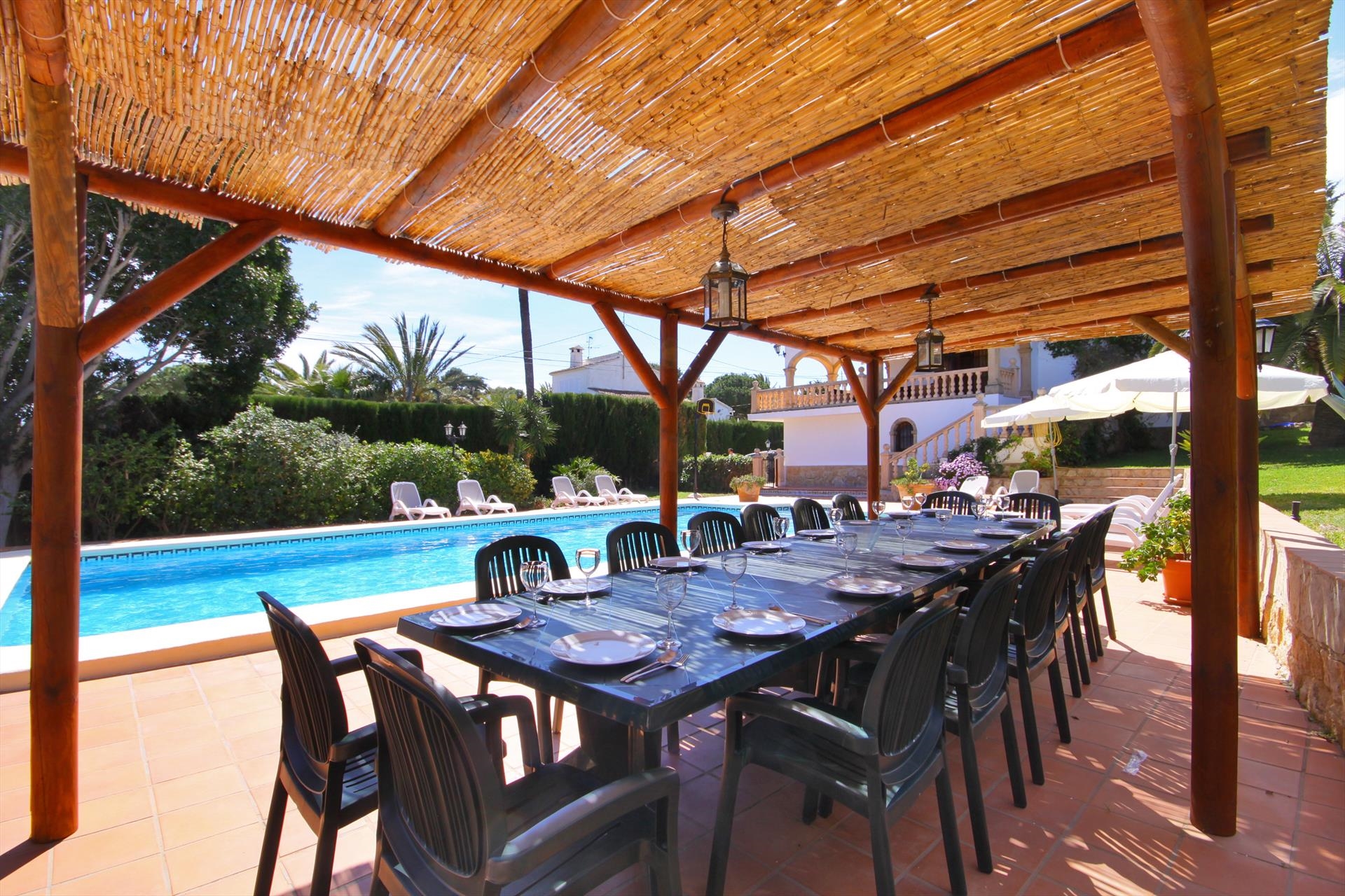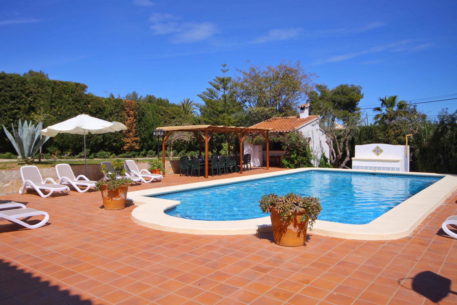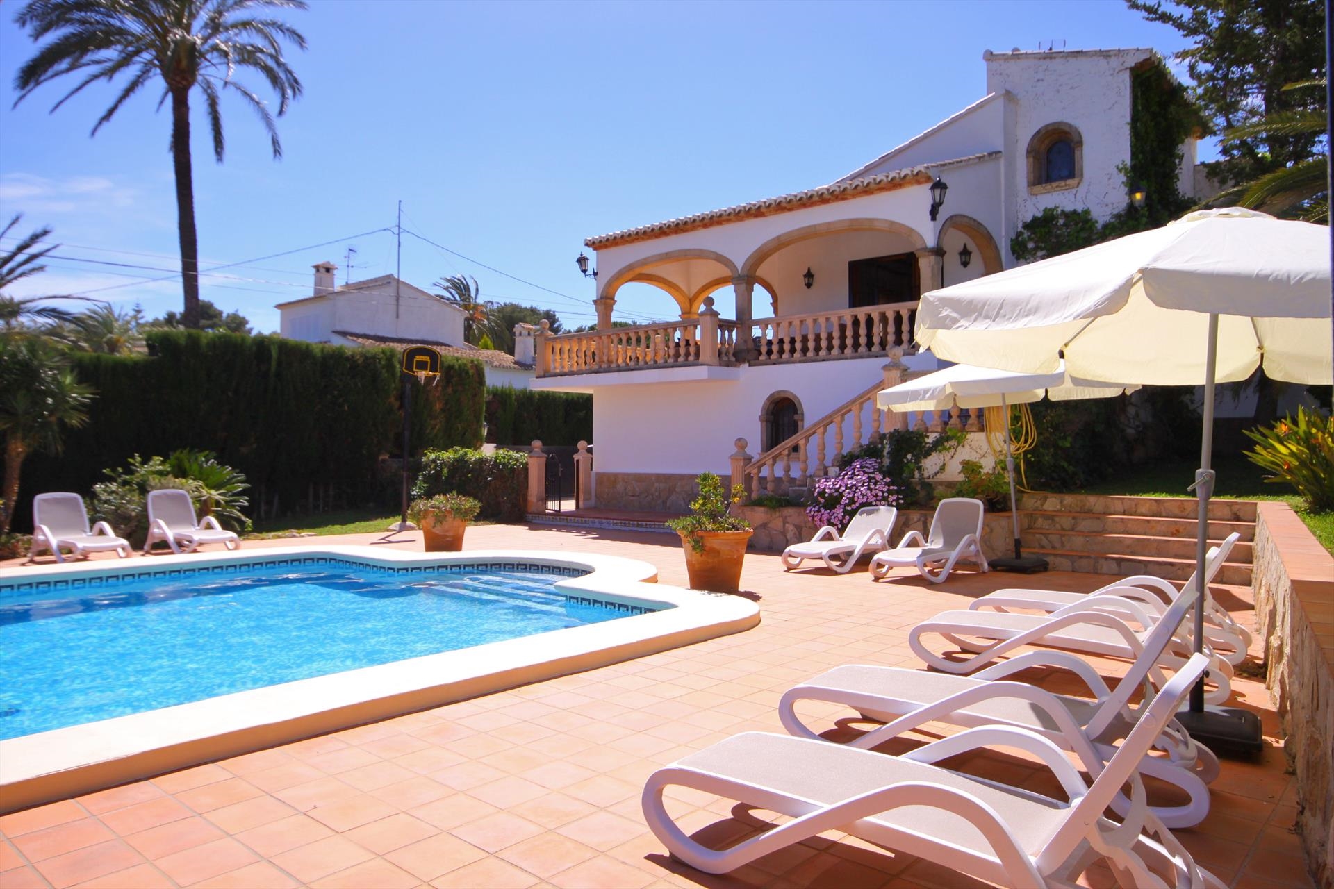 Grote en comfortabele villa met privé zwembad in Javea, aan de Costa Blanca, Spanje voor 16 personen. De villa ligt in een heuvelachtige en residentiële kustomgeving en op 2 km van het strand van El Arenal, Javea.