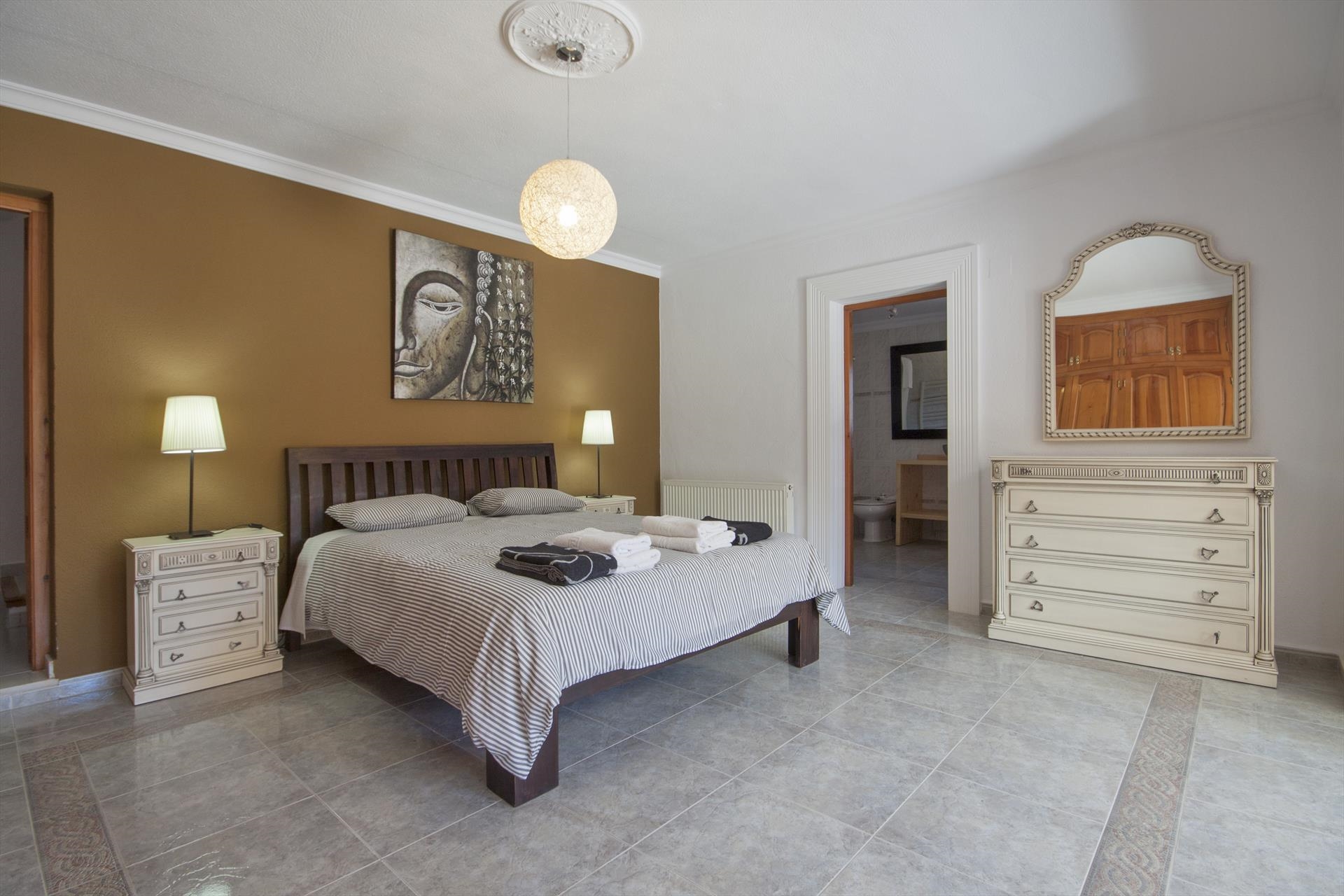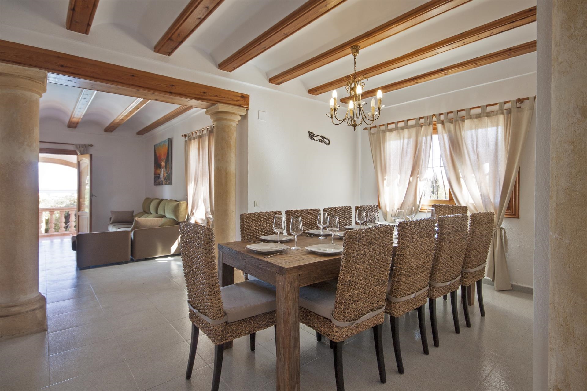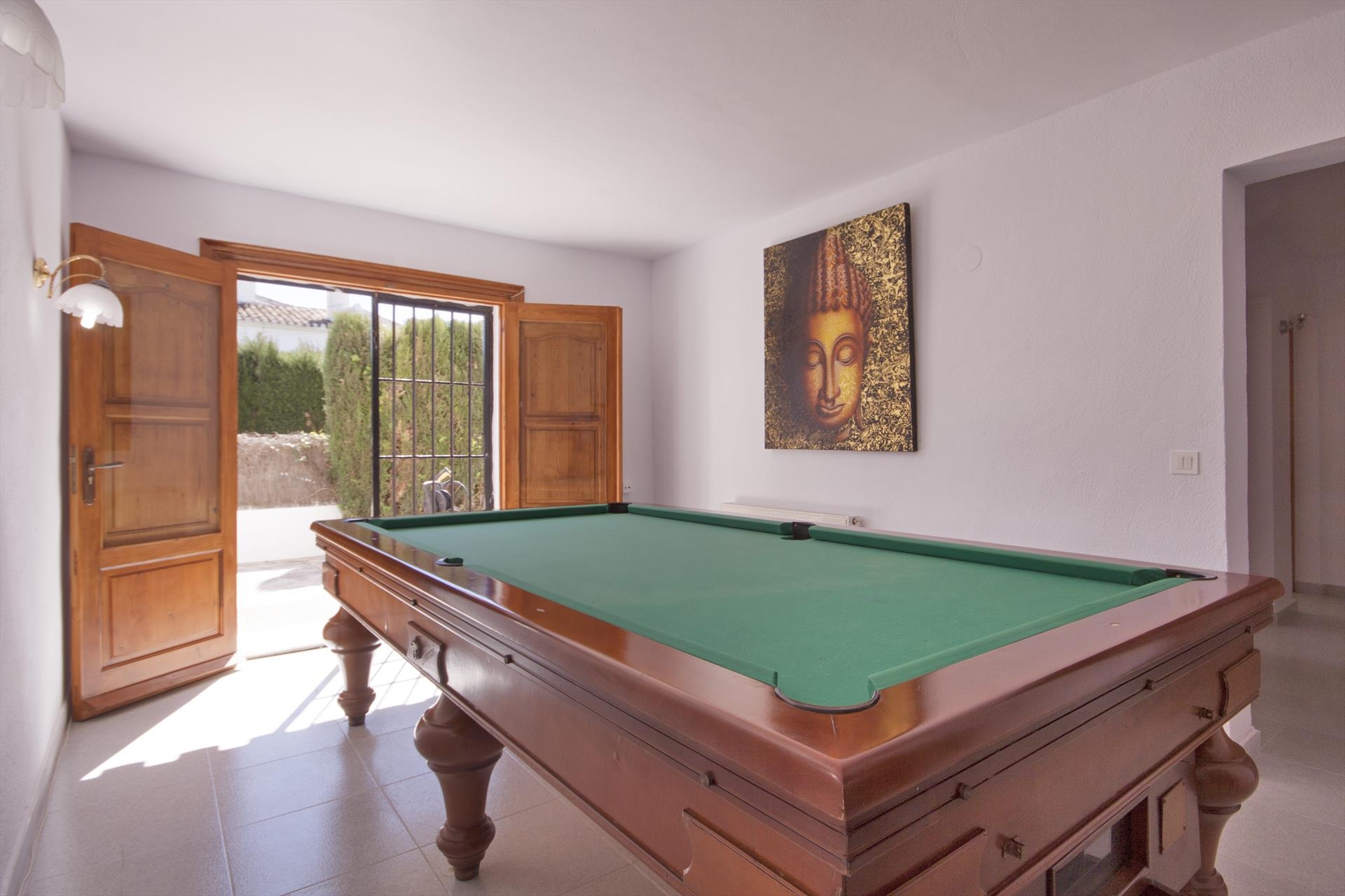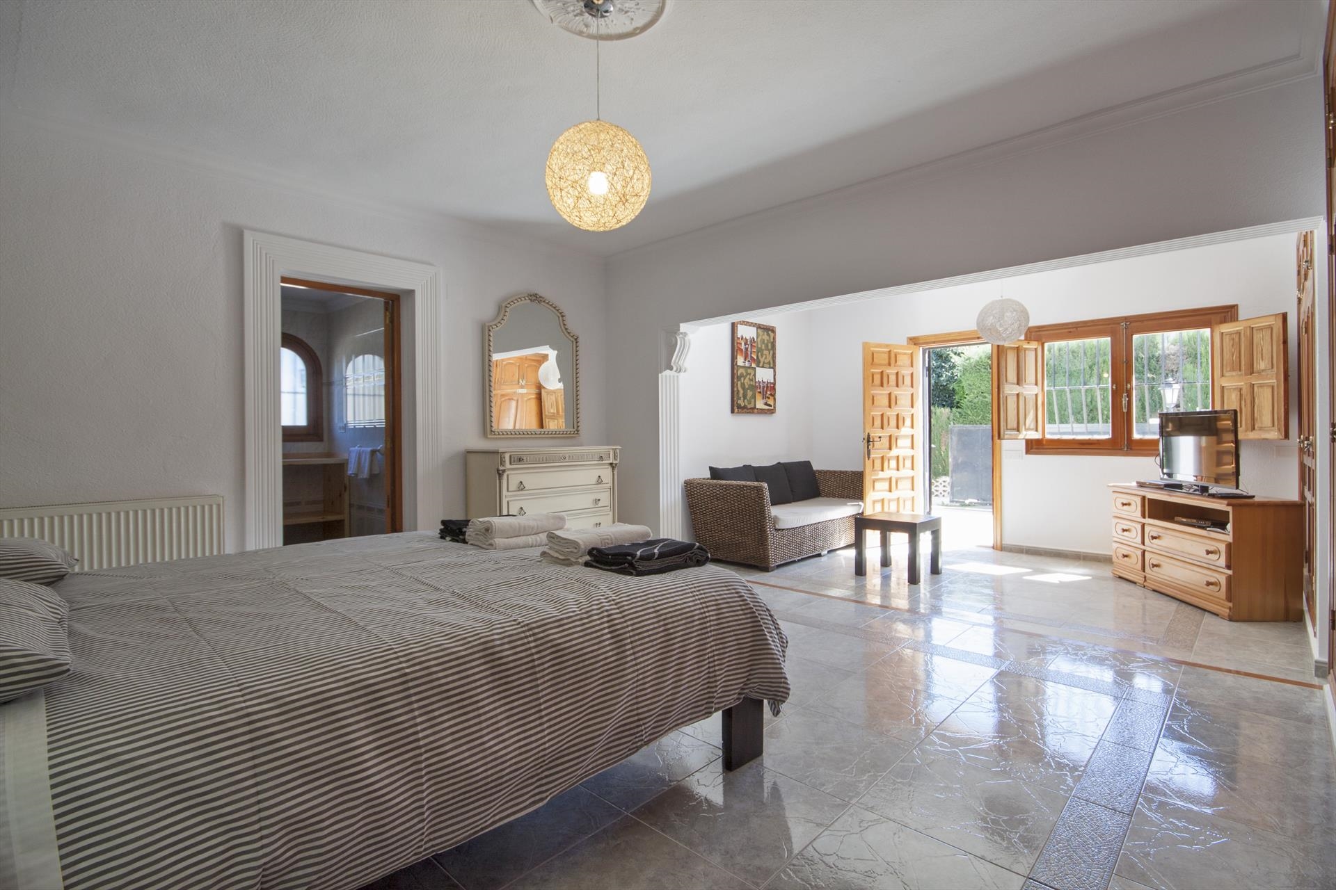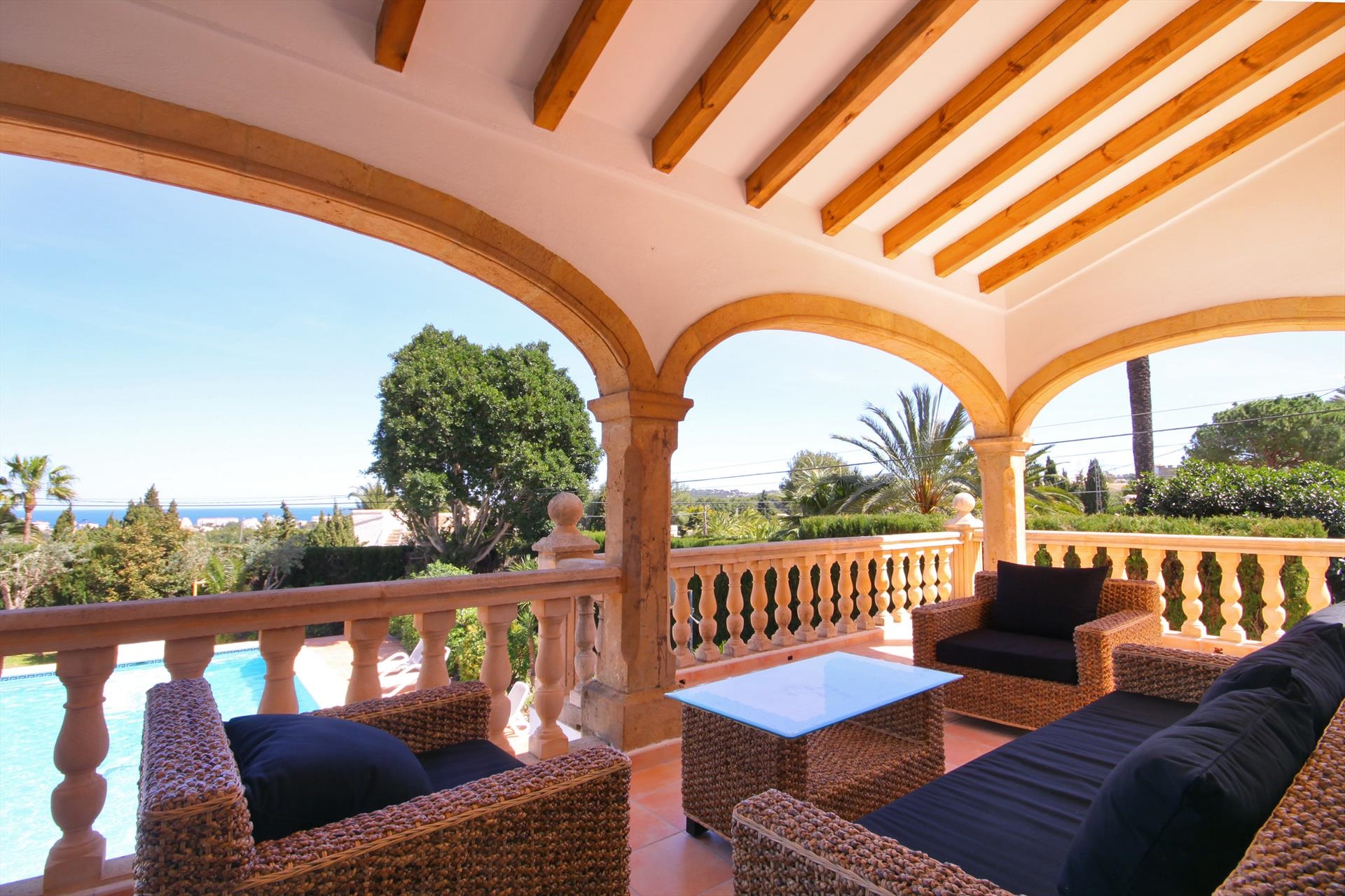 Grote en comfortabele villa met privé zwembad in Javea, aan de Costa Blanca, Spanje voor 16 personen. De villa ligt in een heuvelachtige en residentiële kustomgeving en op 2 km van het strand van El Arenal, Javea.