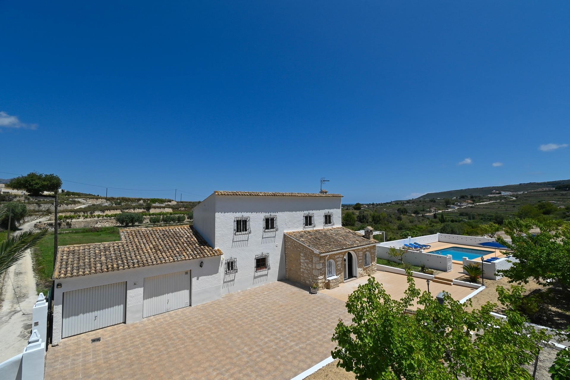 Idylische en prachtig gelegen finca met uitzicht op het dal en de wijngaarden van Benitachell. Deze finca gelegen op twee verdiepingen biedt veel rust en privacy. Op het terrein bevinden zich diverse citrusbomen, waarvan u letterlijk de vruchten mag plukken. Buiten vindt u een volledig ingerichte keuken met paellero waardoor u nooit binnen hoeft te koken!