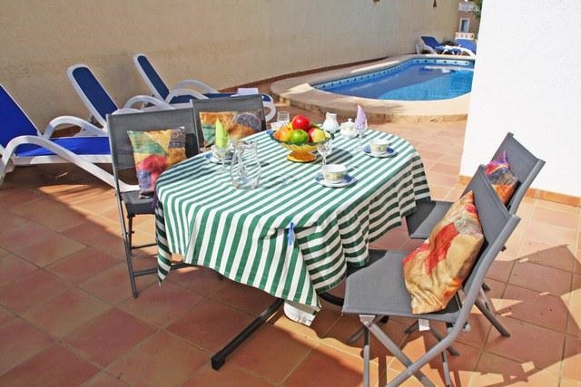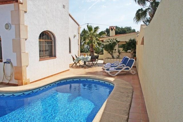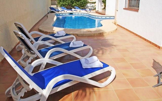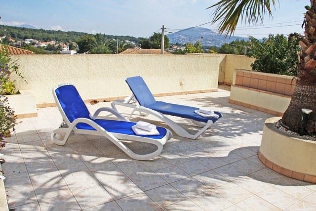 Grote villa met privé zwembad in Moraira, aan de Costa Blanca, Spanje voor 8 personen. De villa ligt in een heuvelachtige en residentiële omgeving, dichtbij supermarkten en op 1 km van het strand van Cala Punta Estrella.