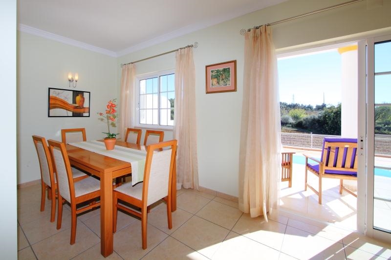 Eetkamer: eettafel met 6 stoelen, uitgang tot het terras & zwembad.