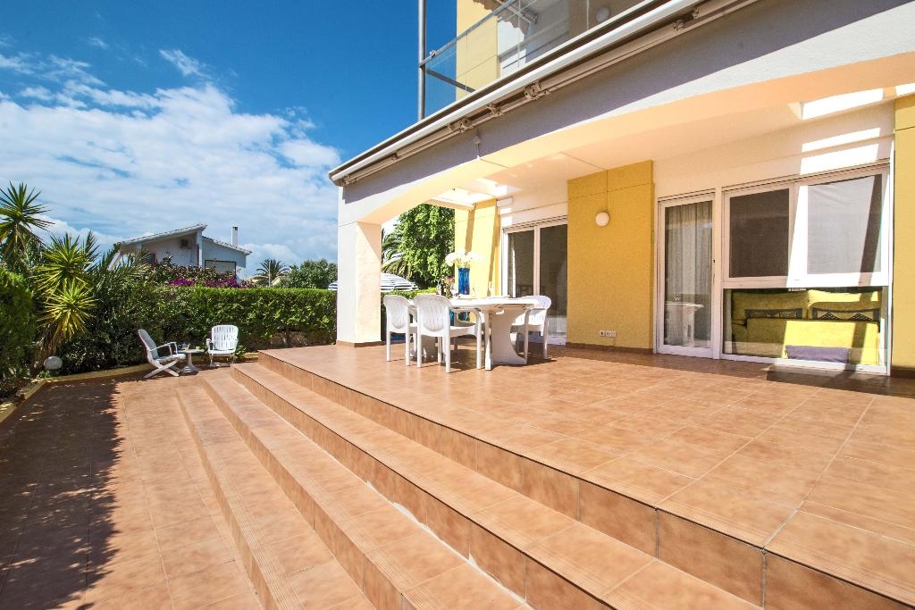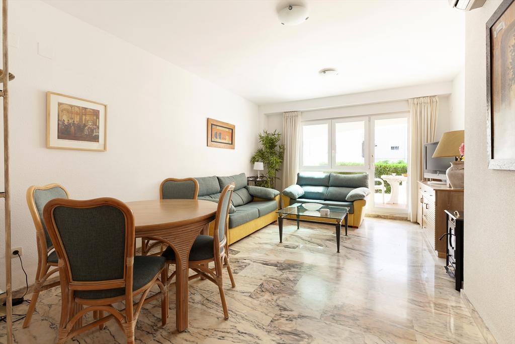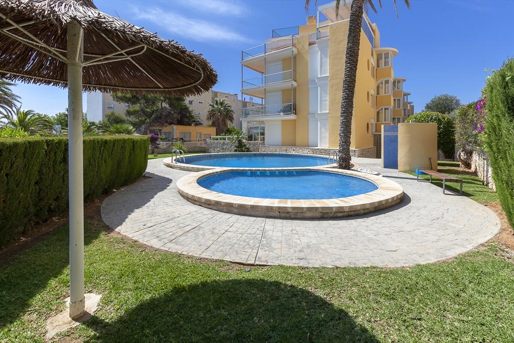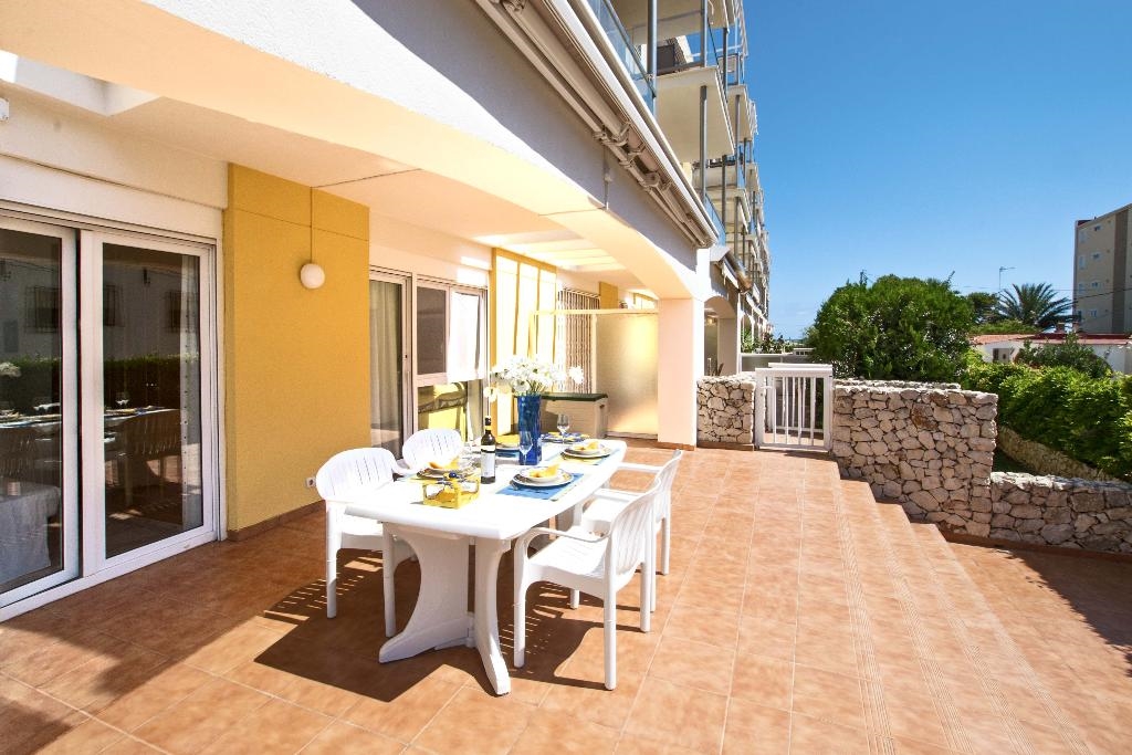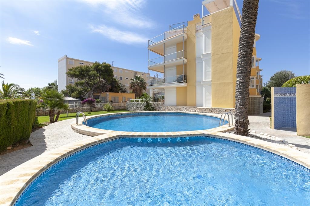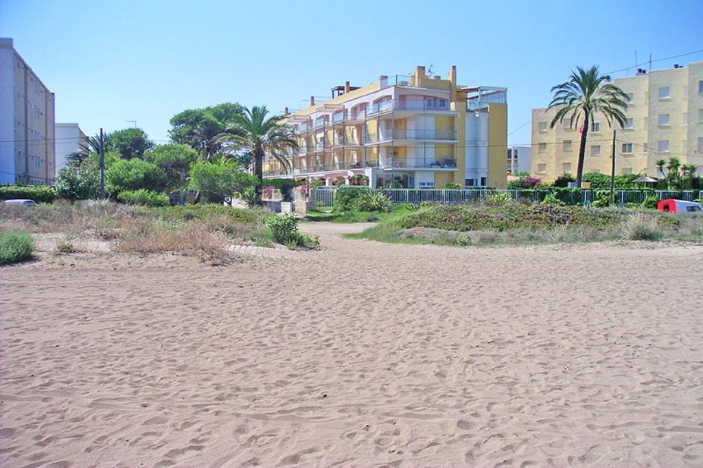 Het wooncomplex "Catamarán 1" is aan de Carretera Las Marinas km 1 gelegen , en biedt directe toegang tot het zandstrand van Las Marinas, en een gemeenschappelijk zwembad met apart kinderbad, omgeven door terrassen en gazon. Het aangeboden appartement is op de begane grond gelegen en heeft ook een eigen terras met een kleine tuin en een kleine deur die toegang geeft tot het gemeenschappelijk zwembad en het strand. De dichtstbijzijnde supermarkt en diverse bars en restaurants, alsmede de tennisclub van Denia kunnen te voet bereikt worden. De bushalte is ook heel dichtbij.