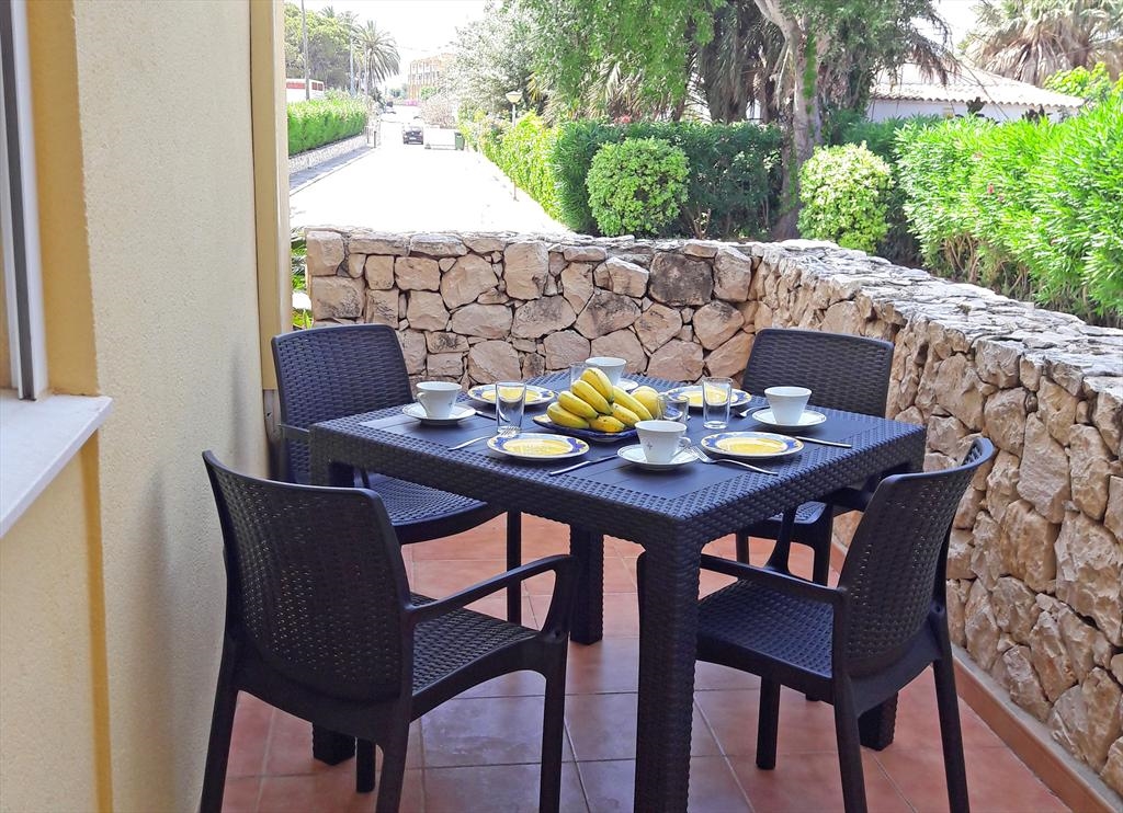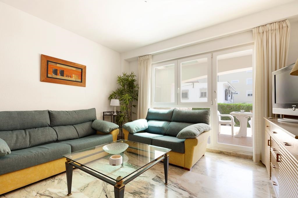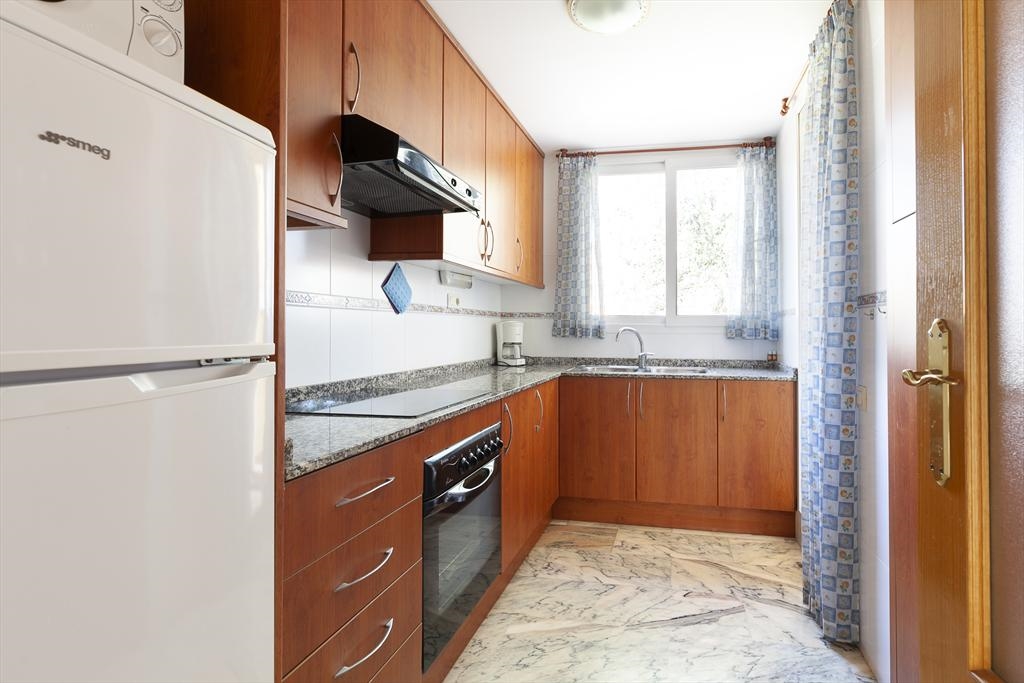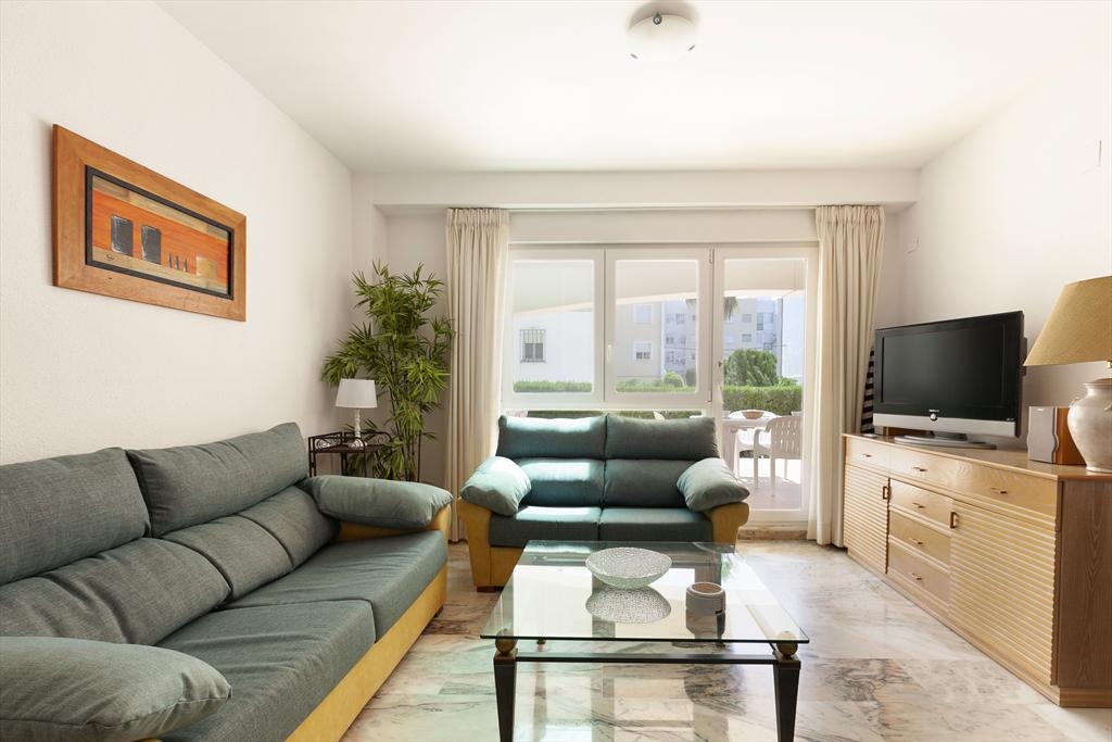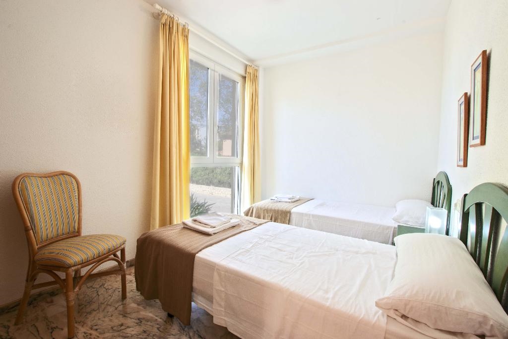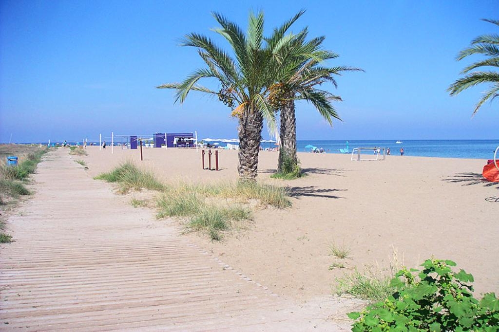 Het wooncomplex "Catamarán 1" is aan de Carretera Las Marinas km 1 gelegen , en biedt directe toegang tot het zandstrand van Las Marinas, en een gemeenschappelijk zwembad met apart kinderbad, omgeven door terrassen en gazon. Het aangeboden appartement is op de begane grond gelegen en heeft ook een eigen terras met een kleine tuin en een kleine deur die toegang geeft tot het gemeenschappelijk zwembad en het strand. De dichtstbijzijnde supermarkt en diverse bars en restaurants, alsmede de tennisclub van Denia kunnen te voet bereikt worden. De bushalte is ook heel dichtbij.